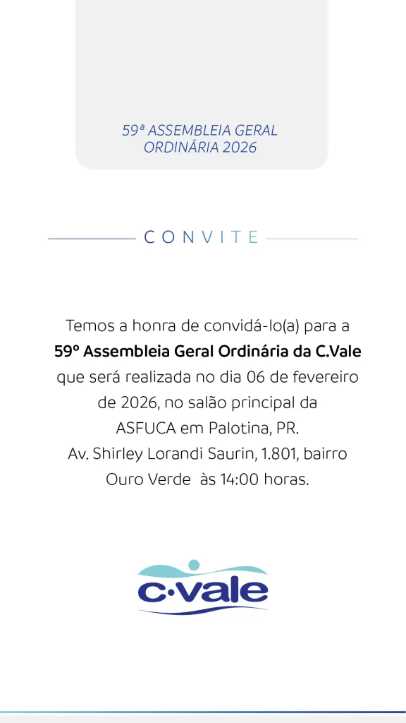 A Cooperativa Agroindustrial C.Vale realiza, na próxima sexta-feira (06), a 59ª Assembleia Geral Ordinária (AGO). O encontro acontece a partir das 14 horas, no salão principal da Asfuca, em Palotina (PR), e será conduzido pelo diretor-presidente do Conselho de Administração, Alfredo Lang.