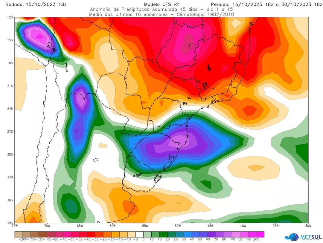 A segunda metade de outubro seguirá com chuva acima a muito acima da média em grande parte do Sul do Brasil, projeta a MetSul Meteorologia. Os maiores acumulados no Rio Grande do Sul devem se dar no Noroeste e no Norte do estado com volumes em diversas cidades de 200 milímetros a 300 milímetros, mas com acumulados pontuais na quinzena de 300 milímetros a 400 milímetros.