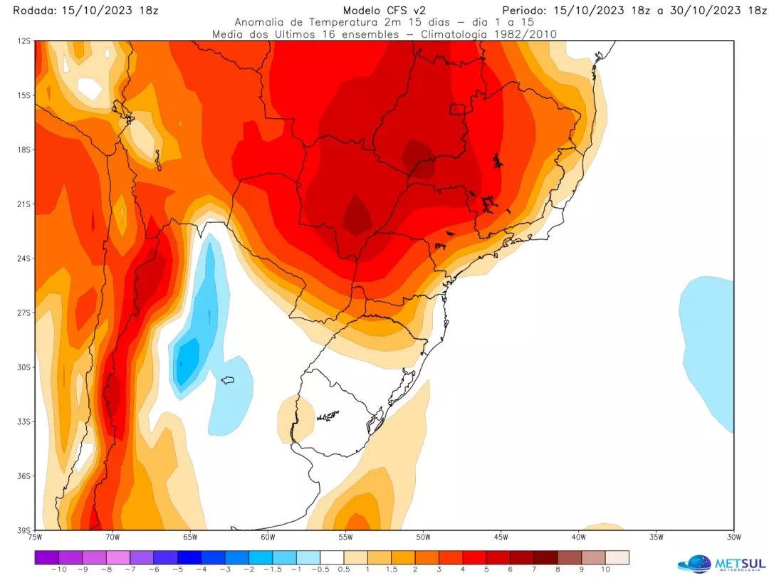 O padrão não se altera nesta segunda metade de outubro. A previsão é de temperatura novamente acima a muito acima da média no Centro-Oeste e no Sudeste do Brasil. O calor será constante no interior de São Paulo, em Minas Gerais e nos estados do Centro-Oeste com a maioria dos dias apresentando máximas perto ou acima dos 40ºC no Centro do Brasil. Em alguns dias, o calor será muito excessivo.