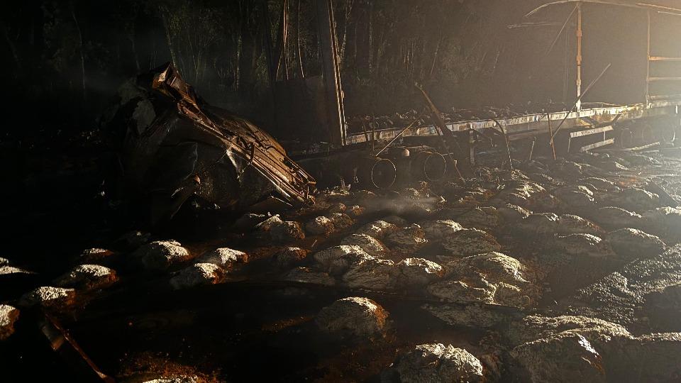 Devido à gravidade do acidente, a rodovia foi totalmente interditada no sentido litoral e Curitiba para a contenção das chamas. Devido à combustão, não foi possível identificar a carga transportada pelos caminhões.