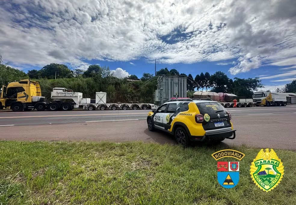 Depois de mais de 15 dias dias parada por falta de autorização especial para circulação, a carreta de 124 rodas que faz o transporte de um transformador da Itaipu com mais de 122 toneladas que saiu de Foz do Iguaçu, no Paraná, e tem como destino Blumenau, pode retomar a viagem na terça-feira (11). Mas foi parada novamente quilômetros depois.