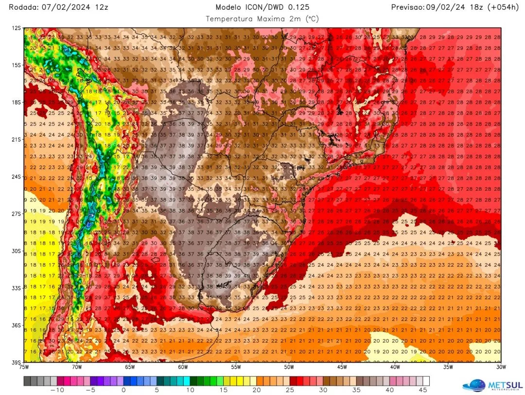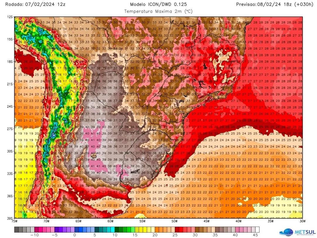De acordo com dados de estações do Instituto Nacional de Meteorologia, as máximas desta quarta-feira no Rio Grande do Sul atingiram 39,2ºC em Quaraí; 38,0ºC em Uruguaiana; 37,6ºC em Alegrete; 37,5ºC em São Borja; e 36,3ºC em São Luiz Gonzaga. A Grande Porto Alegre anotou 36,0ºC em Campo Bom e Porto Alegre foi a 33,7ºC.