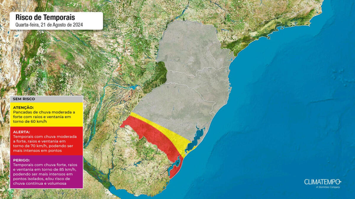 Para esta quarta-feira (21), o alerta principal está nas áreas do Rio Grande do Sul, especialmente durante a tarde e a noite, abrangendo regiões do oeste, campanha e sul do estado. Nessas áreas, há um risco elevado de temporais, acompanhados de ventos fortes que podem atingir velocidades entre 71 e 90 km/h. Nas demais áreas do estado, os ventos também serão intensos, com rajadas entre 51 e 70 km/h. Em Santa Catarina e no Paraná, o tempo permanece seco, mas as condições mudarão rapidamente.