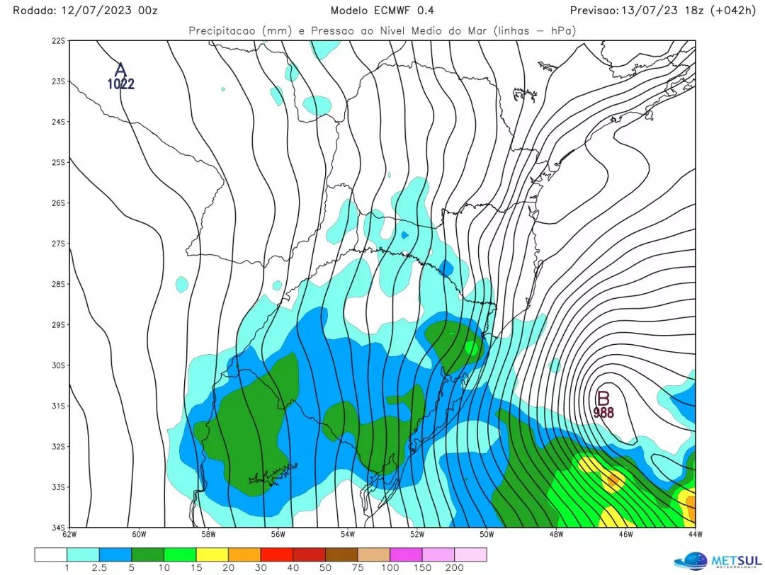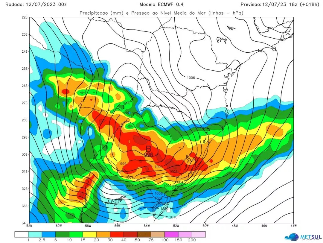 Centro de baixa pressão se aprofunda muito com queda de pressão atmosférica reduzida ao nível do mar abaixo de 1000 hPa nesta quarta-feira (12) sobre o Rio Grande do Sul e tem início uma ciclogênese (formação de ciclone).