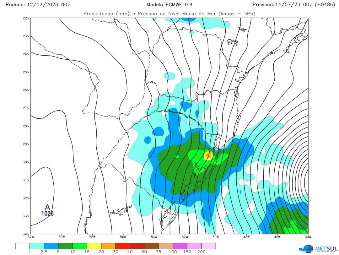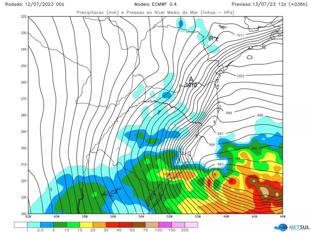 O centro do ciclone vai estar sobre o Leste gaúcho, na altura de Porto Alegre. Chove em quase todo o Rio Grande do Sul e forte a torrencialmente em muitos locais. A chuva mais volumosa se concentra no Centro, Sul e o Leste do Estado. Uma frente fria se organiza e avança com chuva localmente forte e risco de tempestades isoladas fortes com potencial para fenômenos severos isolados de vento pelo Noroeste e o Norte gaúcho, o Oeste e o Meio-Oeste catarinense e o Oeste do Paraná. Vento moderado a forte na maioria das regiões gaúchas com rajadas por vezes intensas na costa, em especial entre Rio Grande e o Sul do Litoral Norte. Vento muito forte ainda em pontos isolados do Norte do Estado e da Campanha.