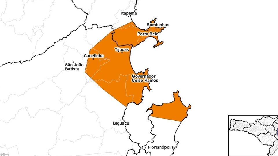 A Defesa Civil informou, às 8h12, que a chuva persistente está sendo registrada nas cidades de Biguaçu, Bombinhas, Canelinha, Florianópolis, Governador Celso Ramos, Itapema, Porto Belo, São João Batista e Tijucas.