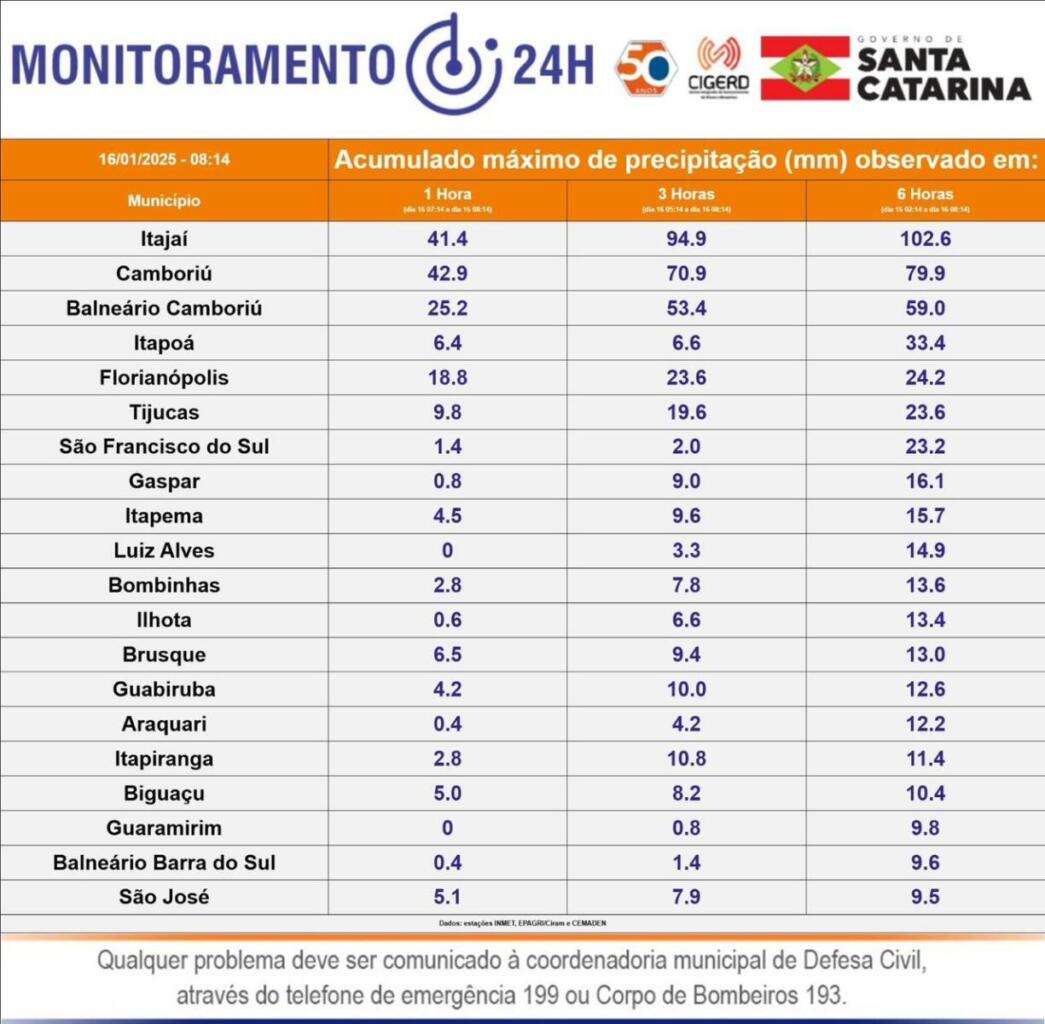 Itajaí, localizada na região litoral norte catarinense, foi o local que registrou o maior número de precipitação máxima acumulada, chegando em 134.6 milímetros, em seis horas.