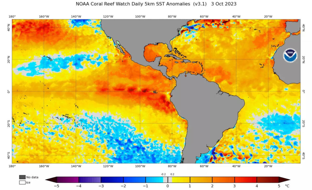 O mapa acima mostra anomalias de temperatura da superfície do mar, de acordo com a NOAA, no dia 3 de outubro, em que se observa a tradicional faixa de águas mais quentes do que a média, característica do El Niño, na região equatorial.