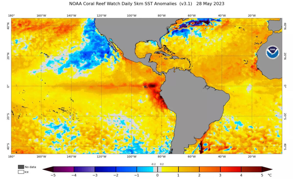 De acordo com o último boletim semanal da Administração Nacional de Oceanos e Atmosfera (Noaa), dos Estados Unidos, a anomalia de temperatura da superfície do mar era de +0,4ºC na denominada região Niño 3.4, no Pacífico Equatorial Central, que é usada oficialmente para definir se há um El Niño na forma clássica e de impacto global. O valor está na faixa de neutralidade de -0,4ºC a +0,4ºC, mas no limite do território de El Niño.