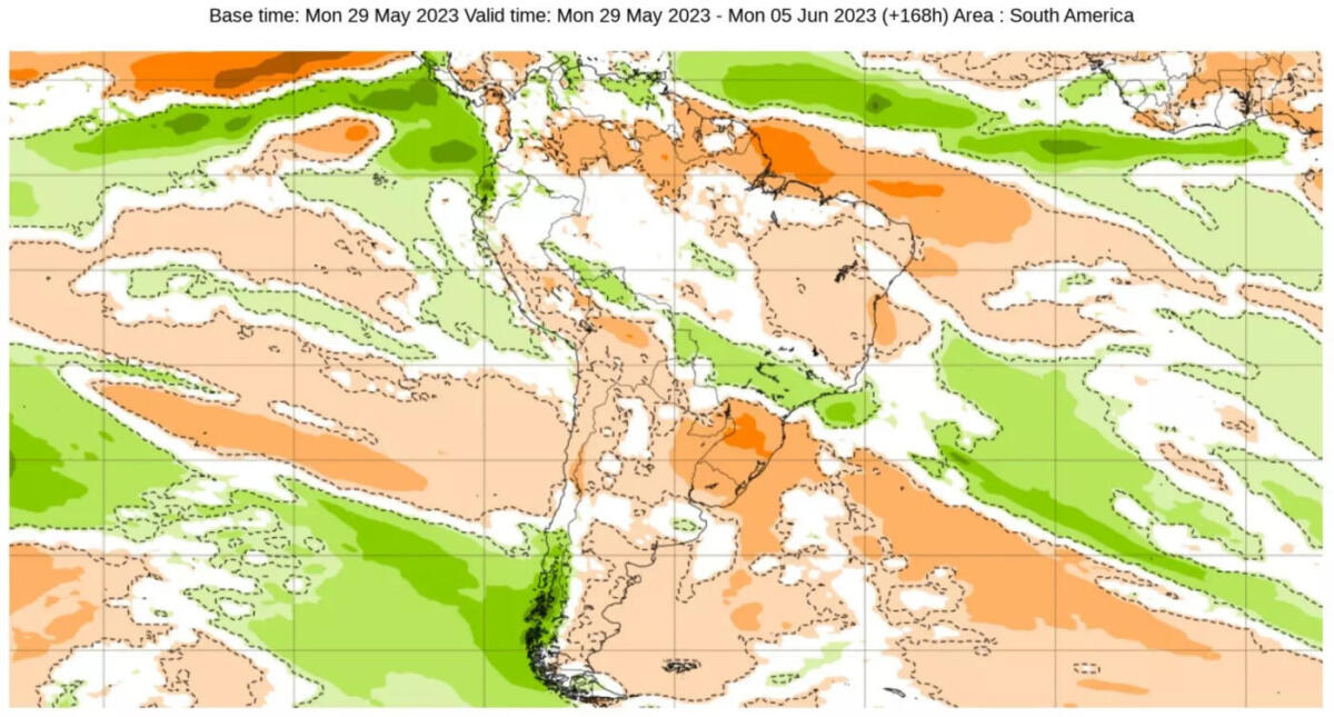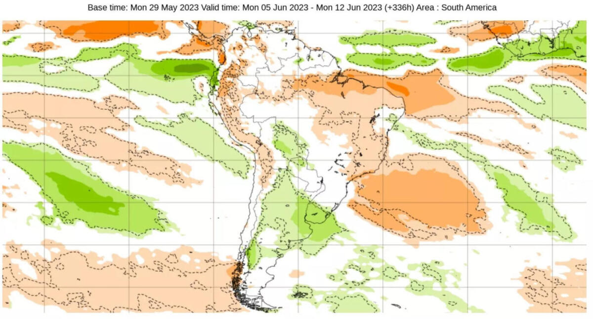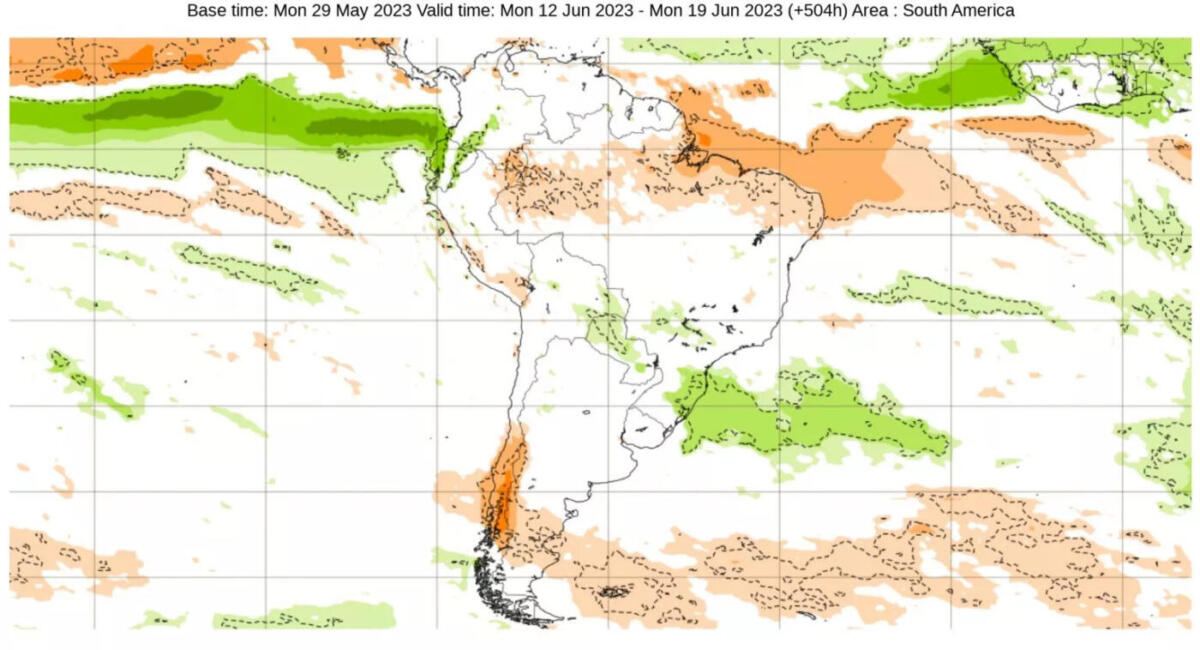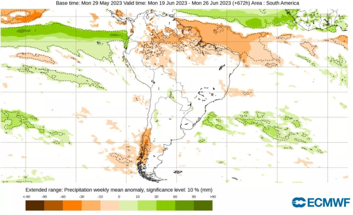 Os mapas abaixo mostram as projeções semanais de chuva para o mês de junho do modelo europeu em que se observa a tendência de chuva perto com áreas acima da média no Sul e em parte do Centro-Oeste, em particular no Mato Grosso do Sul.