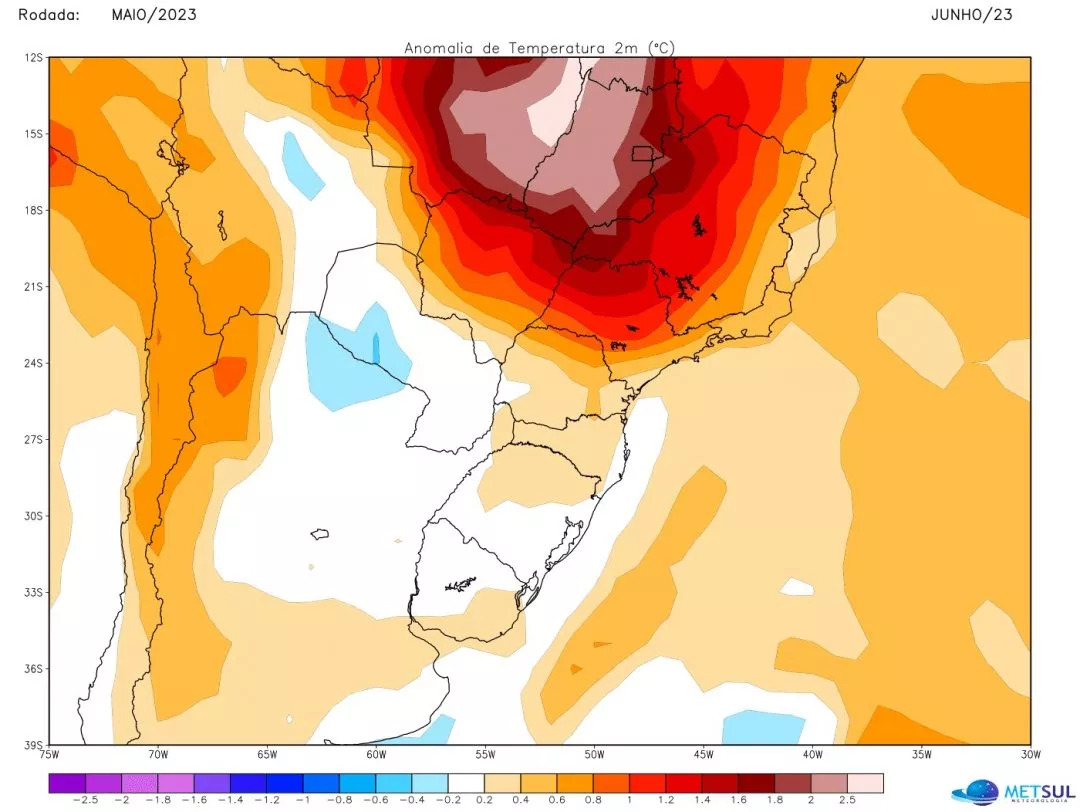 Grande parte dos modelos internacionais de clima projeta um junho de temperatura acima da média no Centro-Sul do Brasil com sinal mais positivo no Planalto Central, entre o Centro-Oeste e parte do Sudeste. É o que sinaliza, por exemplo, o modelo Nmme com forte anomalia positiva de temperatura no Centro do Brasil.