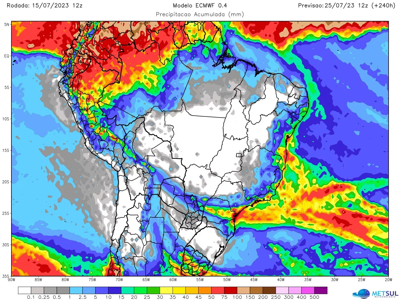 A passagem de uma frente fria e o posterior fluxo de umidade de um potente centro de alta pressão no Atlântico Sul devem trazer chuva para o Nordeste catarinense, o Paraná e áreas perto da costa no Sudeste do Brasil nesta terceira semana de julho. Alertamos, inclusive, para o risco de chuva localmente volumosa a excessiva.