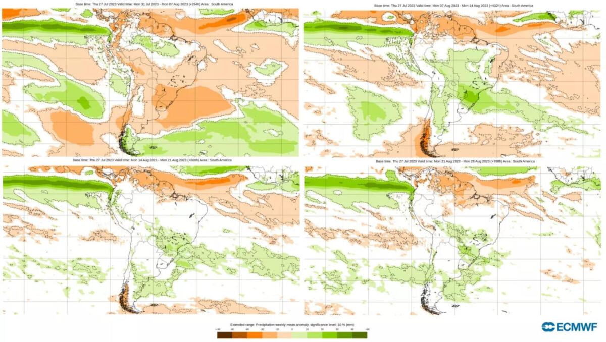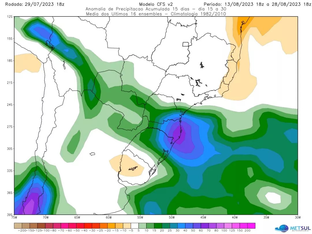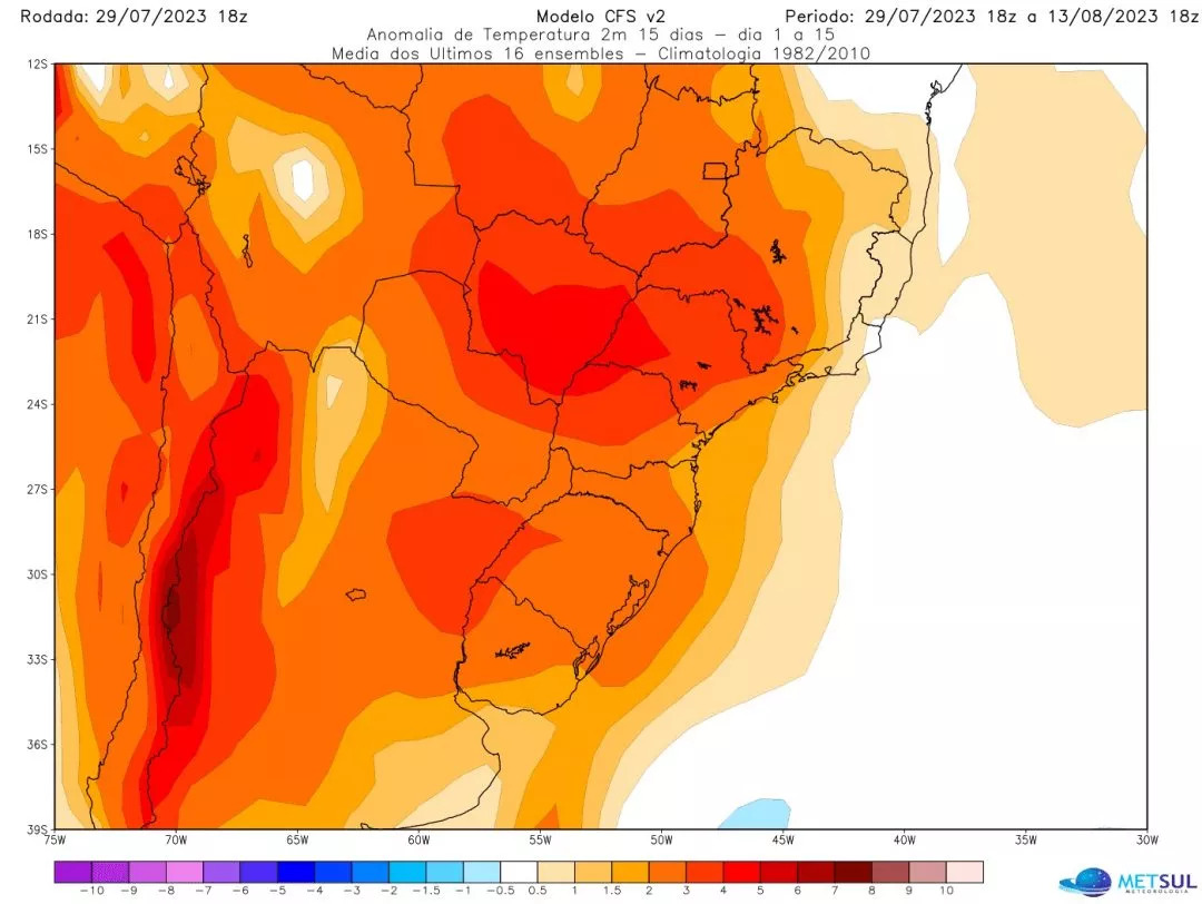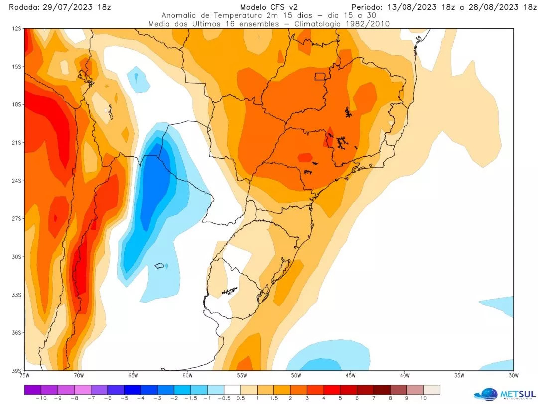 No começo do mês, na primeira semana de agosto, uma massa de ar excepcionalmente quente vai se instalar no Norte da Argentina e no Paraguai, o que vai trazer dias de temperatura muito alta no Sul do Brasil, especialmente mais a Oeste da região.