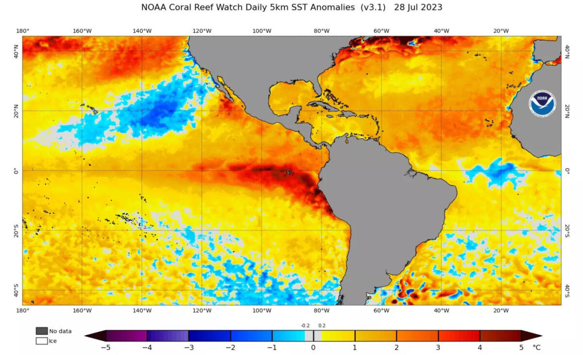 O último boletim semanal da Administração Nacional de Oceanos e Atmosfera (NOAA), dos Estados Unidos, indicou que a anomalia de temperatura da superfície do mar era de 1,1ºC na denominada região Niño 3.4, no Pacífico Equatorial Central. O valor está na faixa de El Niño moderado (+1,0ºC a +1,4ºC).