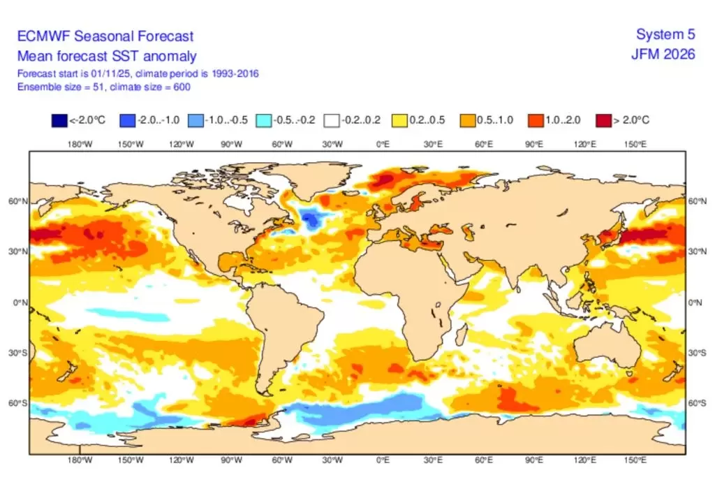 O ponto é que, apesar de tudo, as características deste La Niña são fracas e previsões indicam que o padrão não deve se sustentar por muito tempo. A temperatura média dos oceanos no próximo trimestre (Janeiro – Fevereiro – Março) sofrerá um aquecimento expressivo na região do Oceano Pacífico, extinguindo a presença do fenômeno. Isso pode ser observado na figura abaixo: