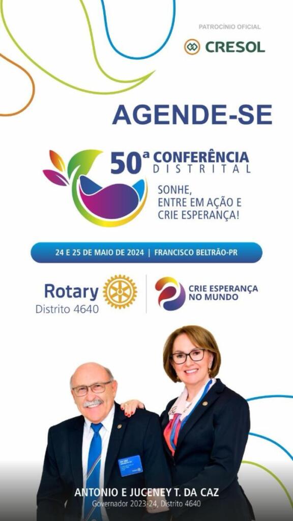 A 50ª Conferência Distrital da área de abrangência do Distrito 4640 do Rotary, que tem como governador o beltronense Antônio Da Caz, e que acontecerá nos dias 24 e 25 de maio, no Centro de Eventos Marabá, deverá reunir rotarianos de 59 municípios em Francisco Beltrão.