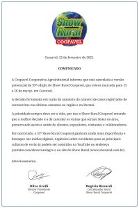 A Coopavel Cooperativa Agroindustrial emitiu comunicado no fim da tarde desta segunda-feira (22) informando que está cancelada a versão presencial da 33ª edição do Show Rural Coopavel, que estava marcada para 15 a 26 de março, em Cascavel.
