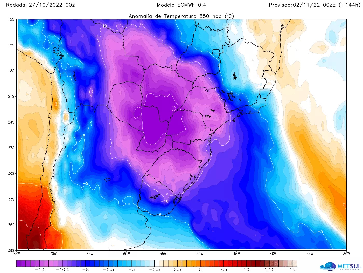 Os modelos numéricos indicam que algumas áreas no Centro da América do Sul podem ter a temperatura mais abaixo da média em todo o mundo no primeiro dia do mês de novembro. Os dados projetam para a tarde da segunda-feira no Norte da Argentina, Bolívia, Paraguai e extremo Oeste do Mato Grosso do Sul, onde nesta época do ano predomina o calor, temperatura até 15ºC a 17ºC abaixo do que é normal para o início do mês.
