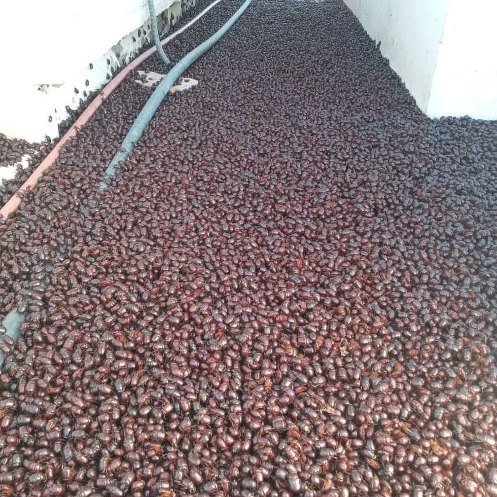 Enquanto isso, moradores e autoridades locais passam o dia retirando os cascudos e enchendo caixas e carrocerias com milhares de besouros para retirá-los da área urbana.