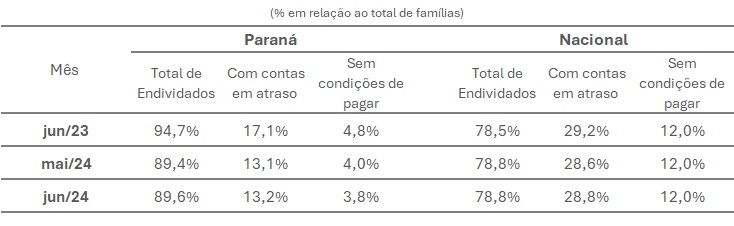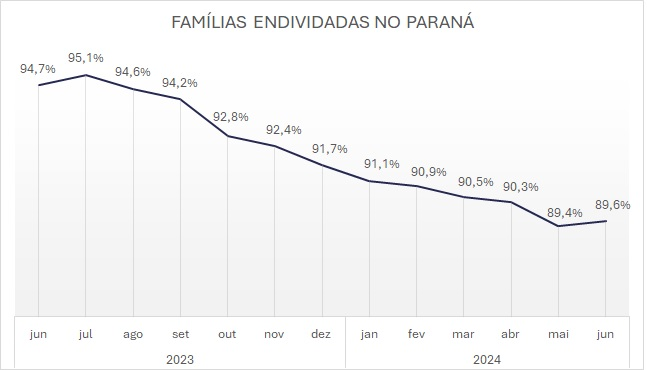 O endividamento das famílias paranaenses manteve-se estável em junho, conforme revela a Pesquisa de Endividamento e Inadimplência do Consumidor (PEIC), conduzida pela Confederação Nacional do Comércio de Bens, Serviços e Turismo (CNC) e pela Federação do Comércio de Bens, Serviços e Turismo do Paraná (Fecomércio PR). Segundo a pesquisa, 89,6% das famílias do estado possuíam algum tipo de dívida, percentual semelhante ao registrado em maio, que foi de 89,4%.