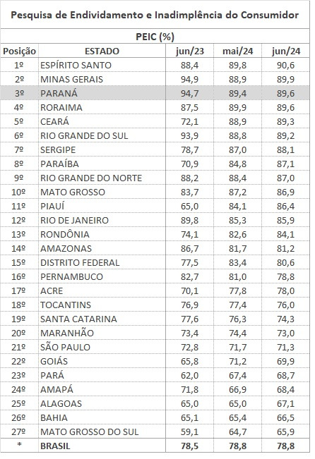 A média nacional de endividamento ficou no mesmo patamar de maio, com 78,8% em junho. Pelo segundo mês consecutivo o Paraná deixou a liderança do ranking de endividados e ocupa a 3ª posição, atrás do Espírito Santo, em que 90,6% das famílias estão endividadas, e de Minas Gerais, que registra 89,9% de mineiros endividados.