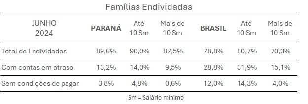 Os paranaenses com renda até dez salários mínimos foram os mais endividados em junho, com 90% de famílias com algum tipo de dívida. Houve relativo aumento em relação a maio, quando 89,5% das famílias nesta faixa econômica possuíam dívidas. A inadimplência ficou estável neste segmento de renda, com 14% ante 13,9% em maio.