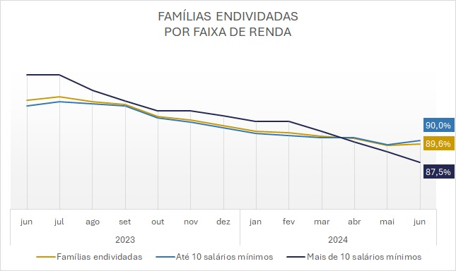 Entre as famílias com renda acima de dez salários mínimos o endividamento baixou de 88,7% em maio para 87,5% em junho. Já a parcela de inadimplentes se manteve em 9,5%.
