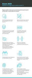 Os participantes do Exame Nacional do Ensino Médio (Enem) 2020 devem estar atentos às regras para evitar o contágio pelo novo coronavírus. As medidas que devem ser adotadas tanto na aplicação do Enem impresso quanto do Enem digital estão previstas nos editais dos exames, e o descumprimento poderá levar inclusive à eliminação dos candidatos.
