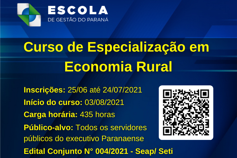 A Escola de Gestão do Paraná (EGP), do Governo do Estado, está com inscrições abertas para o preenchimento de 200 vagas para o curso de Pós-Graduação em Economia Rural. As inscrições podem ser feitas a partir desta sexta-feira (25).