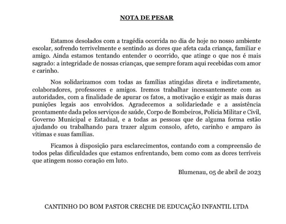 A creche de educação infantil Cantinho do Bom Pastor, de Blumenau, no Vale do Itajaí, em Santa Catarina, publicou uma nota de pesar nas redes sociais nesta quarta-feira (5): “estamos desolados com a tragédia”, após um ataque ocorrido contra crianças no local.