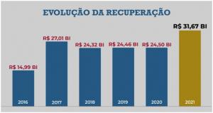 O resultado de recuperação da dívida ativa em 2021 foi R$ 7,2 bilhões maior do que o de 2020, o que representa um crescimento de 29%, destacou a PGFN. O gráfico a seguir mostra o crescimento da arrecadação nos últimos cinco anos: