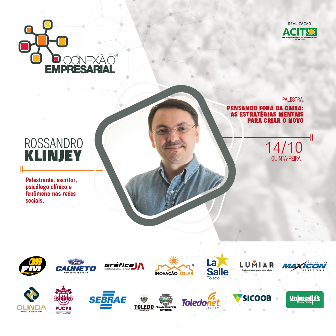 O palestrante, escritor, psicólogo clínico e fenômeno nas redes sociais, Rossandro Klinjey traz o tema ‘Pensando fora da caixa – as estratégias mentais para criar o novo’, na noite de quinta-feira (14) no Conexão Empresarial 2021. O Teatro Municipal de Toledo abre às 19h com início da palestra às 20h.