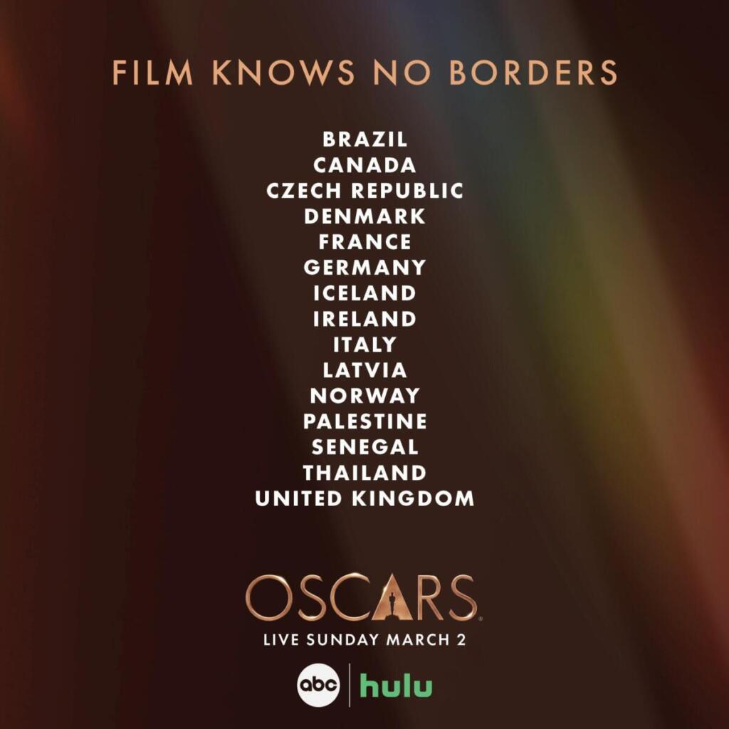 A mensagem que acompanha o anúncio informa: “Quinze filmes avançaram para a próxima rodada de votação na categoria Longa-Metragem Internacional. É aqui que eles pousam no mapa”, referindo-se aos países e títulos indicados.