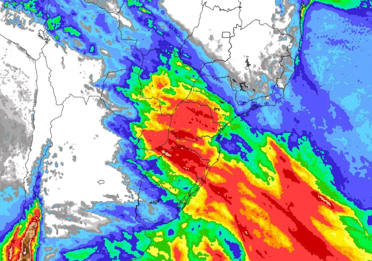 Na quinta, à medida que uma potente massa de ar frio avança pelo interior do continente, o centro de baixa pressão se desloca para o mar e se aprofunda como um ciclone extratropical que dá origem a uma intensa frente fria que vai trazer chuva no começo do dia em muitas áreas do Sul do Brasil e depois se deslocará para o Sudeste e o Centro-Oeste.
