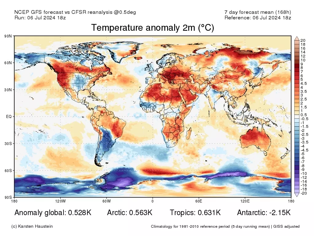 O mapa acima mostra as anomalias de temperatura (desvio da média histórica) indicadas pelo modelo norte-americano GFS do NCEP/NOA para a semana que começa em que se observa como a temperatura deve ficar abaixo da média numa extensa área do Sul da América do Sul.
