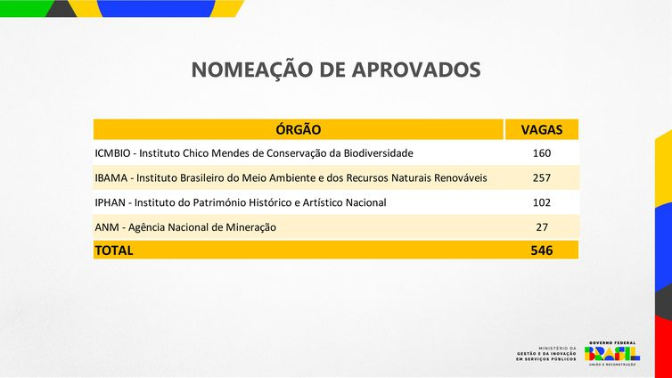 Quanto ao anúncio da nomeação de concursados já aprovados, 257 pessoas serão chamadas para o Instituto Brasileiro do Meio Ambiente e dos Recursos Naturais Renováveis (Ibama), 160 para o Instituto Chico Mendes de Conservação da Biodiversidade (ICMBio), 102 para o Instituto do Patrimônio Histórico e Artístico Nacional (Iphan) e 27 para a Agência Nacional de Mineração (ANM).