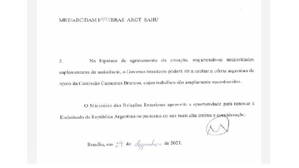 “Na hipótese de agravamento da situação, requerendo-se necessidades suplementares de assistência, o Governo brasileiro poderá vir a aceitar a oferta argentina de apoio da Comissão Capacetes Brancos, cujos trabalhos são amplamente reconhecidos”, diz outro trecho do documento.