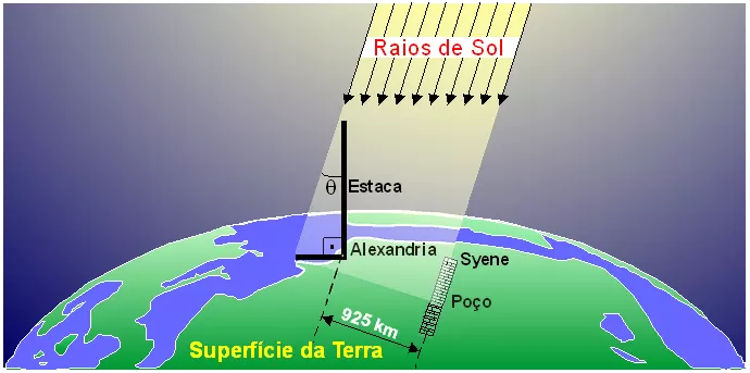 No solstício seguinte, Eratóstenes mandou instalar uma grande estaca em Alexandria. Ao meio-dia, enquanto o Sol iluminava as profundezas do poço em Syene (formando um ângulo de 90° com a superfície da Terra), ele simultaneamente mediu em Alexandria o ângulo da sombra (θ = 7,2°), equivalente a 1/50 de uma circunferência completa. Concluiu, portanto, que o comprimento do meridiano terrestre deveria corresponder a 50 vezes a distância entre Alexandria e Syene.
