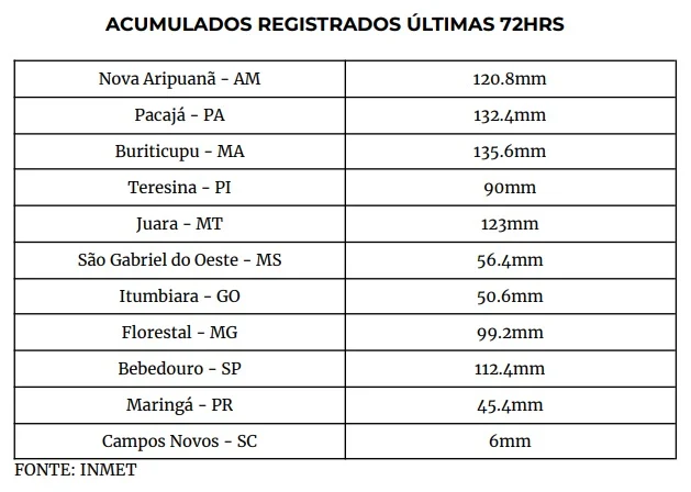 No Maranhão, contudo, os acumulados de chuva já chamaram a atenção no fim de semana. De acordo com dados do Instituto Nacional de Meteorologia (Inmet), choveu 135,6 milímetros sobre o município de Buriticupu (MA) durante as últimas 72 horas. Em Pacajá (PA), o volume ficou próximo durante o mesmo período, com 132,4 milímetros registrados.
