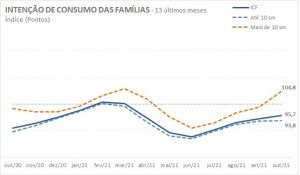 O índice de Intenção de Consumo das Famílias (ICF), aferido pela Confederação Nacional do Comércio de Bens, Serviços e Turismo (CNC) e pela Federação do Comércio de Bens, Serviços e Turismo do Paraná (Fecomércio PR), teve o quarto mês de crescimento consecutivo e marca 95,7 pontos em outubro. Na comparação com setembro, houve alta de 1,3% e na variação anual o crescimento é 5,1%.