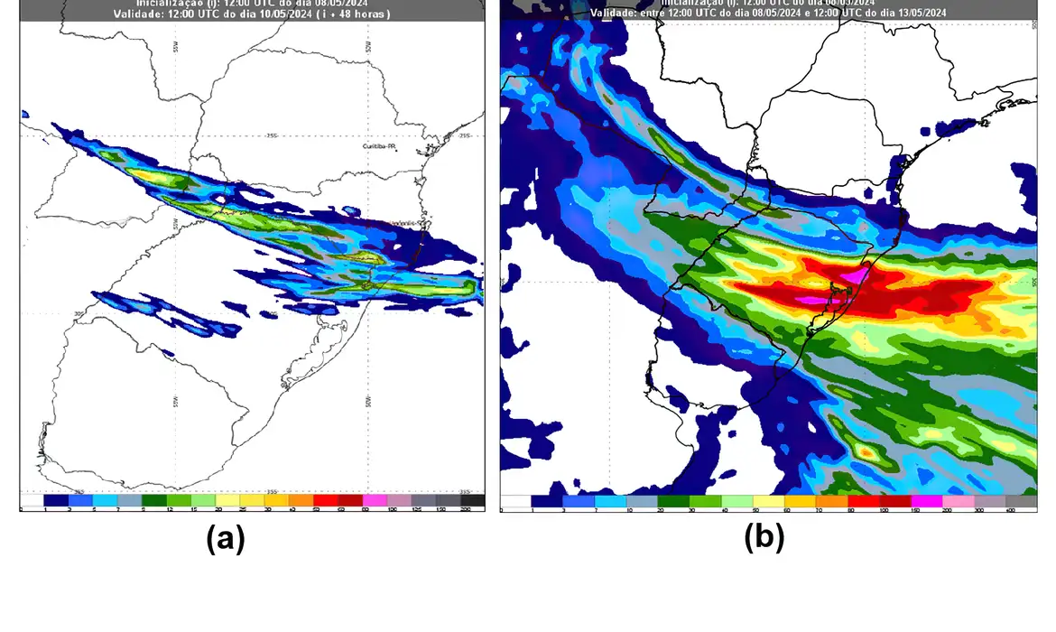 “Neste período, os volumes de chuva podem passar dos 100 milímetros (mm). Ainda conforme a previsão, os ventos mudarão de direção e soprarão predominantemente de sul. Entre o fim do domingo (12) e a segunda-feira (13), as rajadas variam de oeste a sul e depois de sul, com velocidade acima de 30 km/h. Já na terça-feira (14), os ventos enfraquecem”, informou o instituto.