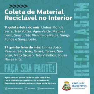 Seguindo o cronograma mensal, haverá coleta de lixo reciclável no interior de Quatro Pontes nesta primeira quinta-feira (04), contemplando as linhas Flor da Serra, Três Voltas, Água Verde, Mathias Lenz, Guaçu, São Vicente de Paula, Sanga Funda e Sanga Leão.