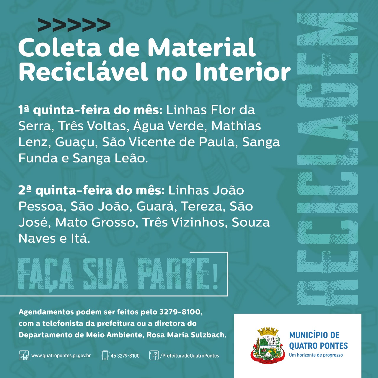 Seguindo o cronograma mensal, haverá coleta de lixo reciclável no interior de Quatro Pontes nesta primeira quinta-feira (04), contemplando as linhas Flor da Serra, Três Voltas, Água Verde, Mathias Lenz, Guaçu, São Vicente de Paula, Sanga Funda e Sanga Leão.