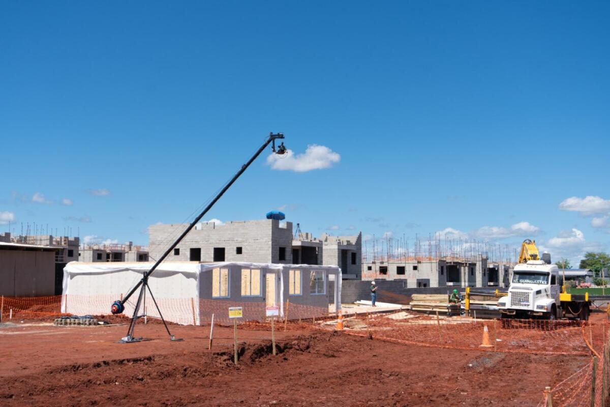 A montagem das primeiras casas foi acompanhada por jornalistas e convidados na cerimônia de lançamento do projeto no canteiro de obras.
