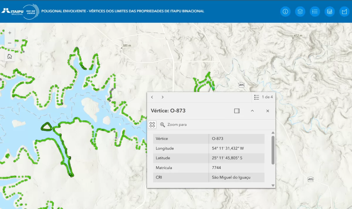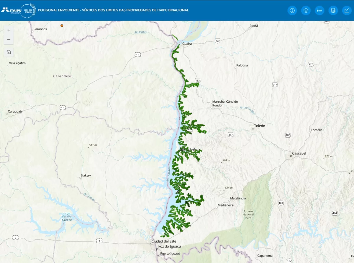 Proprietários de terras vizinhas à Itaipu Binacional, profissionais de georreferenciamento e demais interessados já podem acessar, de forma rápida, um novo site com o mapa interativo dos limites oficiais do reservatório. A plataforma permite visualizar e baixar instantaneamente as coordenadas geodésicas (latitude e longitude) dos limites das áreas de propriedade da Binacional, facilitando o georreferenciamento e a regularização fundiária.