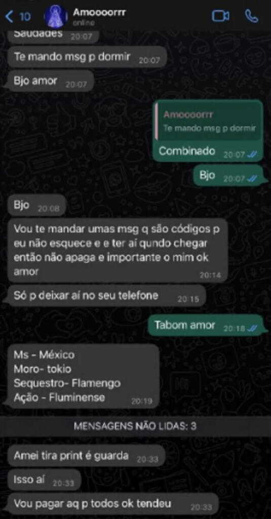 Na conversa por WhatsApp, o termo “Tokio” é usado para se referir ao ex-juiz e ex-ministro do governo Bolsonaro, enquanto “Flamengo” substituiria “sequestro”, e “Fluminense” seria usado no lugar de “ação”