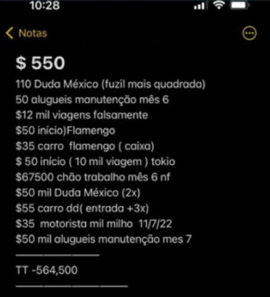 Outra imagem revelada na decisão, obtida pela investigação do caso, mostra anotações que, segundo o documento, aparentam ser um controle de gastos para o crime que envolveria Moro.