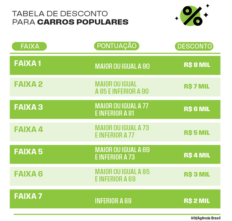 No caso dos carros, os descontos variam de R$ 2 mil a R$ 8 mil e serão concedidos com base em três critérios: social (preço mais baixo), ambiental (carros que poluem menos) e densidade industrial (geração de empregos e uso de peças nacionais).