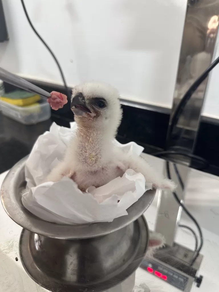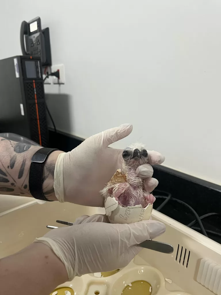 O 57º filhote nascido no RBV é o primeiro de um casal de harpias que está junto há cerca de dez anos. Mantido sob cuidados humanos, em ambiente com temperatura e umidade controlados, ele é alimentado quatro vezes por dia; em uma semana, praticamente dobrou de peso: está com 170gr.