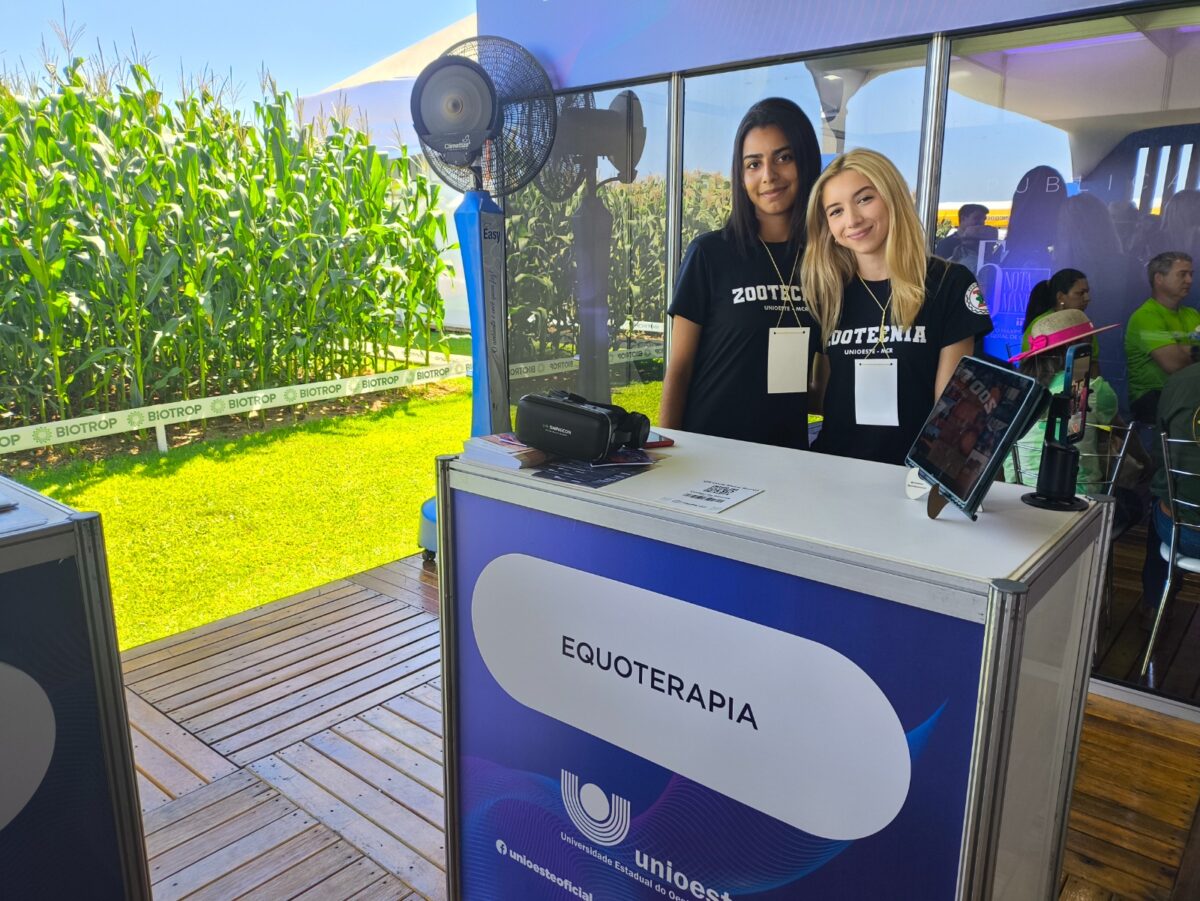 Ainda no estande da Unioeste, as estudantes do segundo ano de Zootecnia do campus de Marechal Cândido Rondon, Milena Vargas e Ayane Martis, apresentam o potencial do emprego de cavalos para o tratamento terapêutico de crianças neurodivergentes, tanto em Transtorno do Espectro Autista (TEA) como em Transtorno de Déficit de Atenção e Hiperatividade (TDAH). A chamada equoterapia foi uma novidade para ambas.